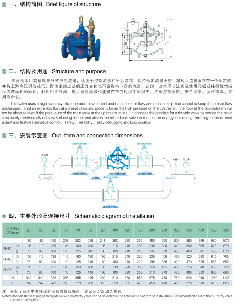 產品特點:工洲牌400x流量控制閥,是一種采用高精度先導式方式控制流量的多功能閥門。適用于配水管需控制流量和壓力的管路中,保持預定流量不變,將過大流量限制在一個預定值,并將上游高壓適當臧低,即使王閥上游的壓力發生變化,也不會影響主閥下游的流量。該閥一改常規節流閥使用孔板或純機械地臧小流域面積的原理,利用相關導閥,大限度地減少能量在節流過程中的損失。如遇緊急情況400XA流量控制閥可以完全截止流量避免損失。控制靈敏度高,安全可靠,調試簡便,使用壽命長。