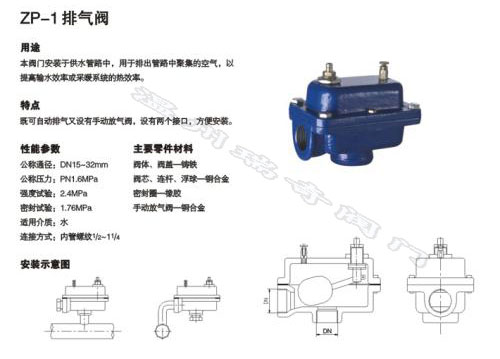 ZP-I、II方形臥式自動排氣閥廣泛應用于熱水采暖系統,冷水空調和熱水加熱系統,風機盤管及消防栓排除空氣。是確保系統正常運行,排除系統管路中氣阻的不可缺少的產品。